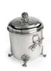 the cylindrical sides with twin scroll handles, the domed lid with a berry finial, raised on four leaf clasped scroll feet; together with a small silver card tray, Birmingham 1930, of shaped square form with a piecrust edge, raised on four scroll feet (2)