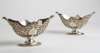 of oval boat shape form, the ornate foliate pierced sides with engraved monogram, associated silver plated liners, raised on an oval foot with shell and gadrooned edge (2)