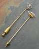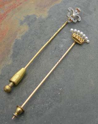 the terminal designed as a fleur de lys, with central seed pearl within a surround of rose cut diamonds and borders of calibre cut rubies; also another stickpin, the terminal designed as a seven pearl coronet, set with circular cut rubies and terminating in seed pearls (2)