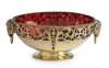 the ornate part fluted and foliate pierced sides with ram’s mask and loop handles and ruby glass liner, raised on a spreading oval foot