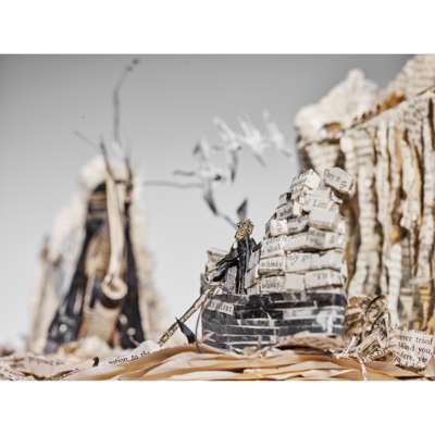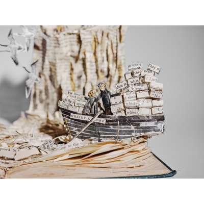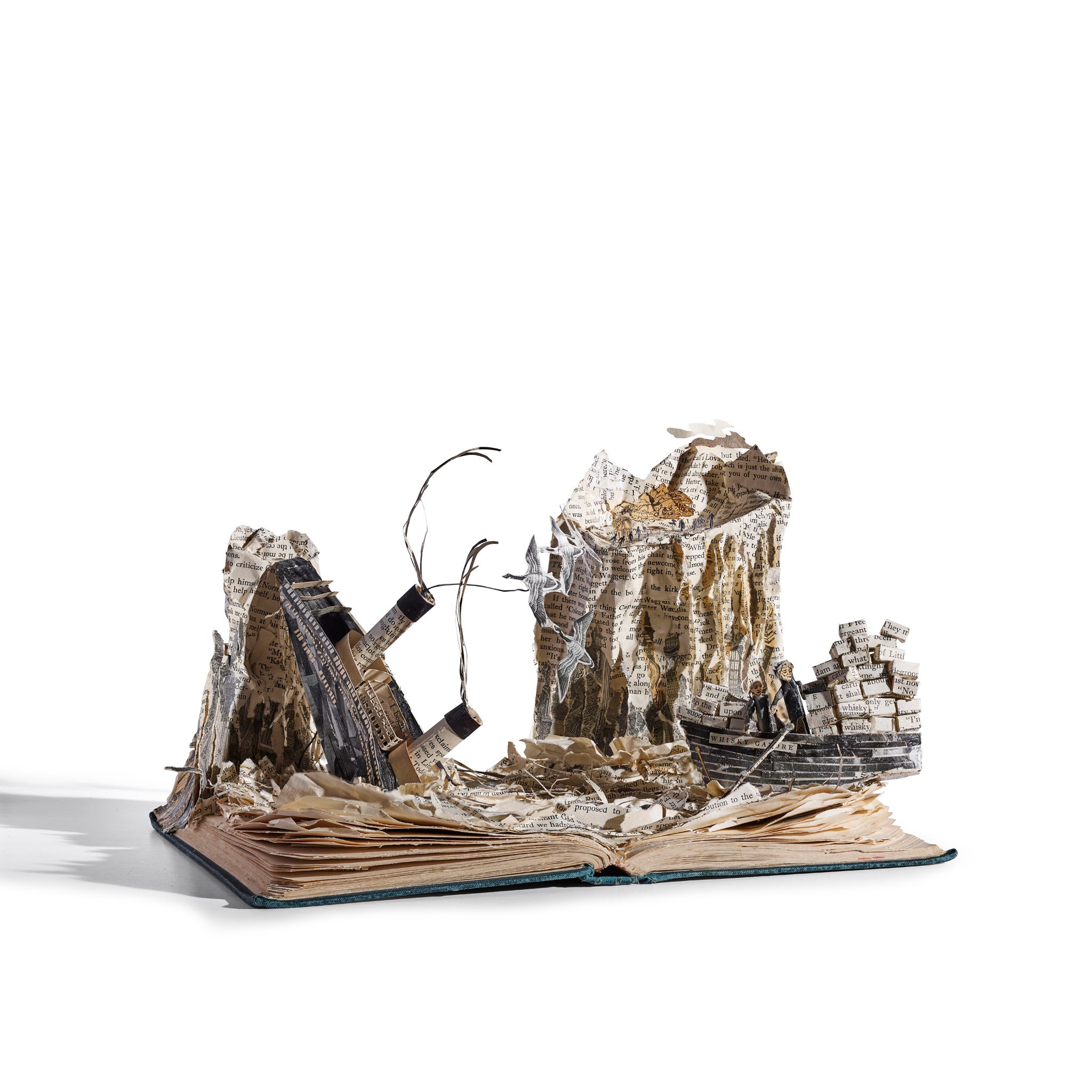 paper and wire sculpture crafted from the leaves of a copy of Compton Mackenzie's 'Whisky Galore', depicting the sinking SS Politician and two islanders with a whisky-laden rowing boat, with artist's handwritten label