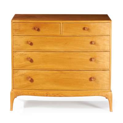 BOW-FRONT CHEST OF DRAWERS, DATED 1966
