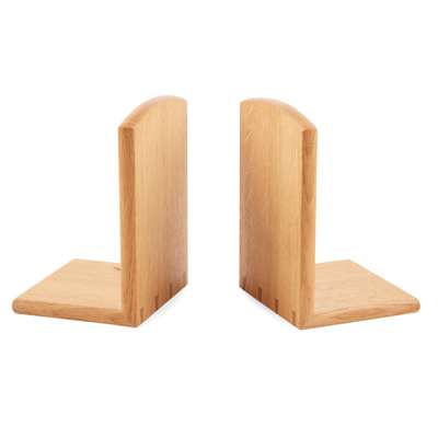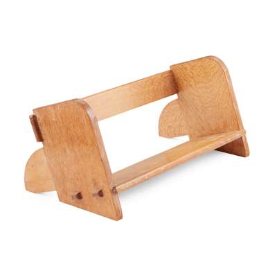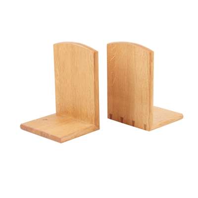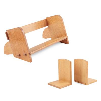 limed oak, stamped W. J. TANNER to underside of each end, 38.5cm (15in) wide, 19cm (7 1/2in) high, 21cm (8 1/4in) deep; together with a PAIR OF BOOKENDS, oak, each stamped BARNSLEY, 13.7cm (5 1/4in) wide, 19.5cm (7 1/2in) high, 12cm (4 3/4in) deep