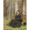 WOMAN SEATED AGAINST TREE TRUNK IN A WOOD
