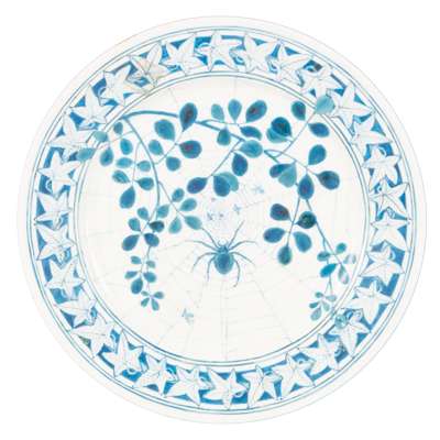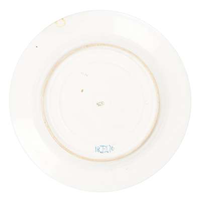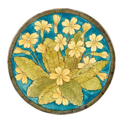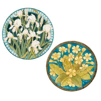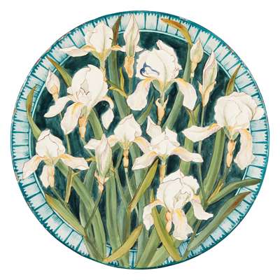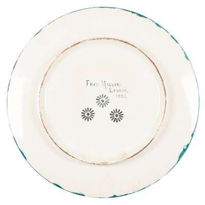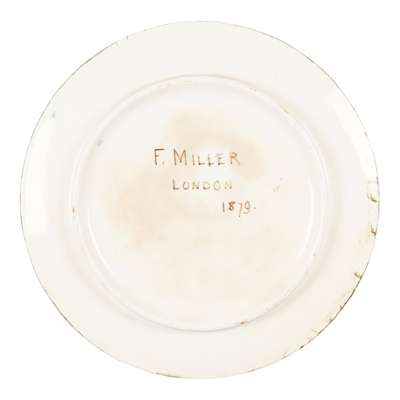 painted earthenware, painted F. Miller/ London/ 1880, 41cm (16 1/4in) diameter; and a SMALLER ART POTTERY PLATE, painted earthenware, painted F. Miller/ London/ 1879, 22cm (8 1/2in) diameter