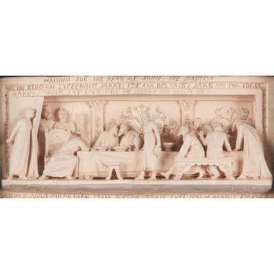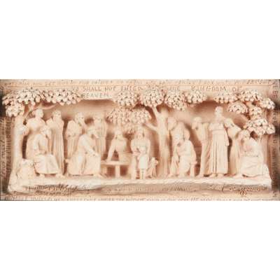 A Word to the Shepherds: inscribed at top "he shall not enter the kingdom of heaven" a word to the shepherds surrounding edge: And Jesus called a little child unto him and in the midst of them and said I say unto you except you be converted and become as humble yourselves. therefore under the mighty hand of God that he may exalt you in due time." Incised H Doulton Co Lambeth - G. Tinworth GT