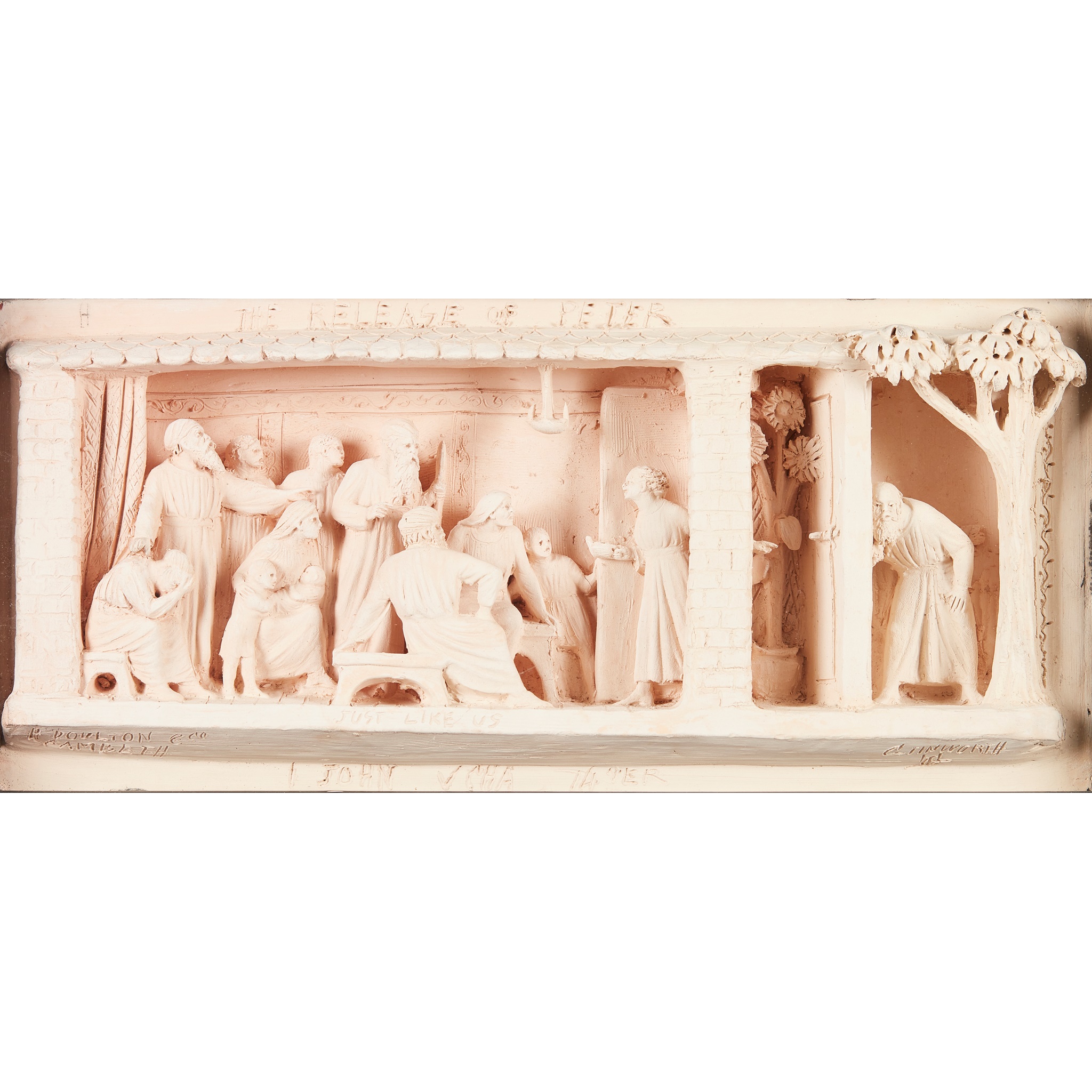 terracotta, each within ebonized wood and gilded frames and incised G. Tinworth, comprising SALOME DEMANDING THE HEAD OF JOHN THE BAPTIST; A WORD TO THE SHEPHERDS; and THE RELEASE OF PETER
