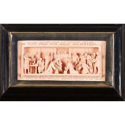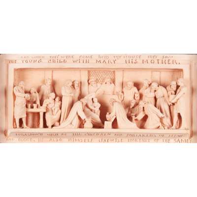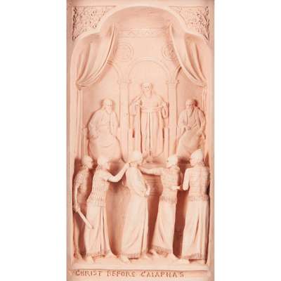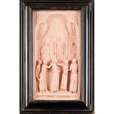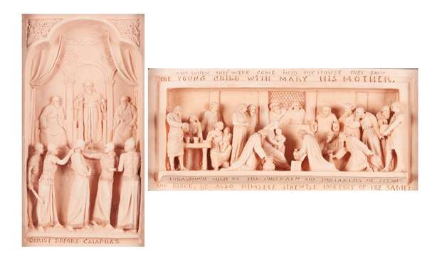 terracotta, each within ebonized wood and gilded frames, incised G. Tinworth, comprising THE YOUNG CHILD WITH MARY, HIS MOTHER; and CHRIST BEFORE CAIAPHAS