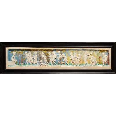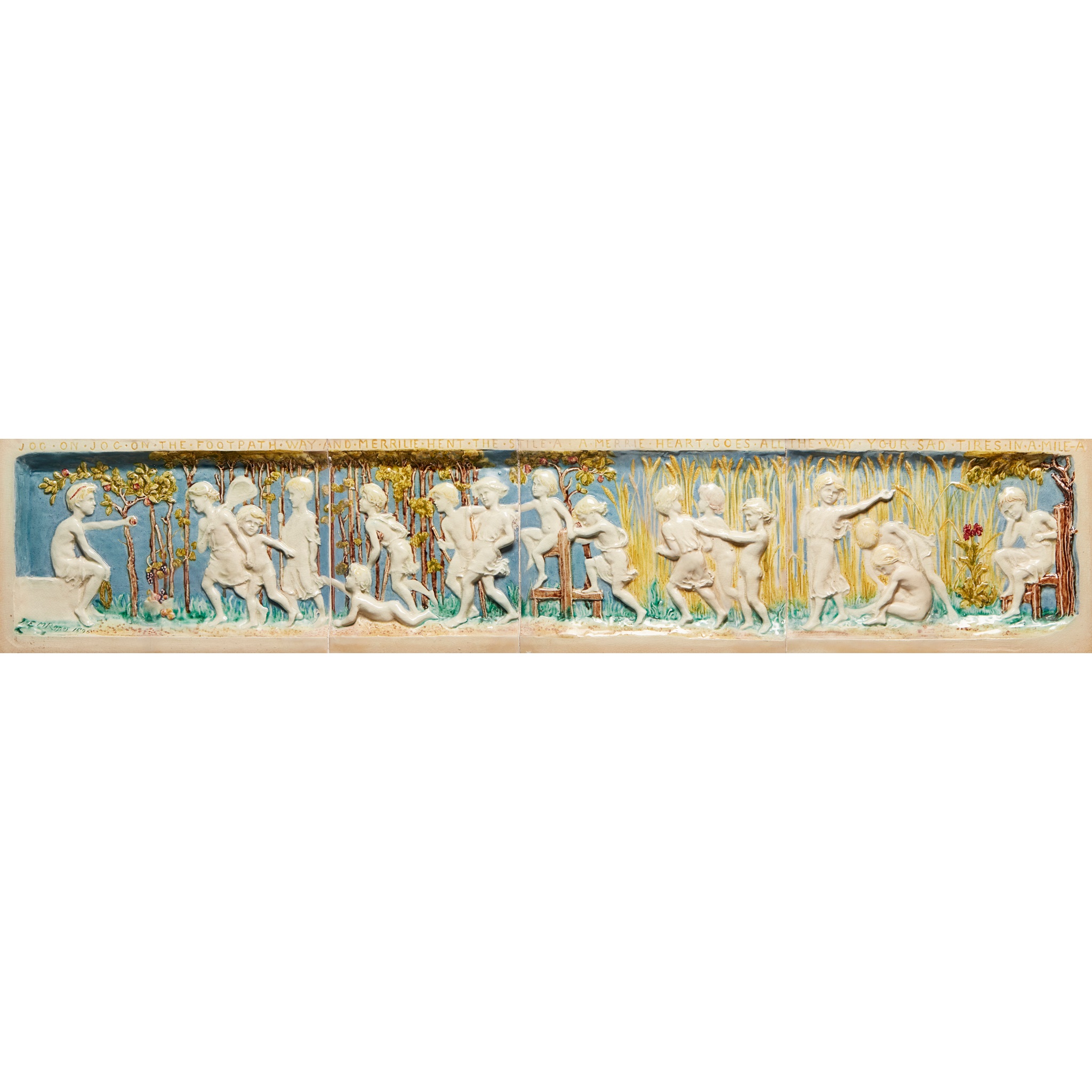 glazed terracotta, incised with inscription JOG-ON-JOG-ON-THE-FOOTPATH-WAY-AND-MERRILIE-HENT-THE-STILE-A-MERRIE-HEART-GOES-ALL-THE-WAY-YOUR-SAD-TIRES-IN-A-MILE-A, signed and dated E.M.ROPE/ 1896, inscribed with factory mark verso and monogrammed E.M.W. (Emily Margaret Wood)