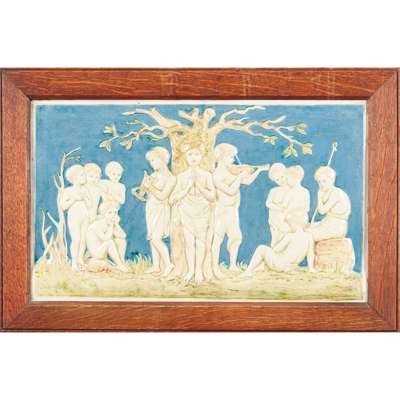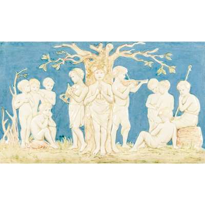 The Studio, Vol. 13, 1898, p. 190 (similar example illustrated), titled 'Della Robbia panel Melody Designed by Miss Rope and painted by Miss E.M. Wood'.