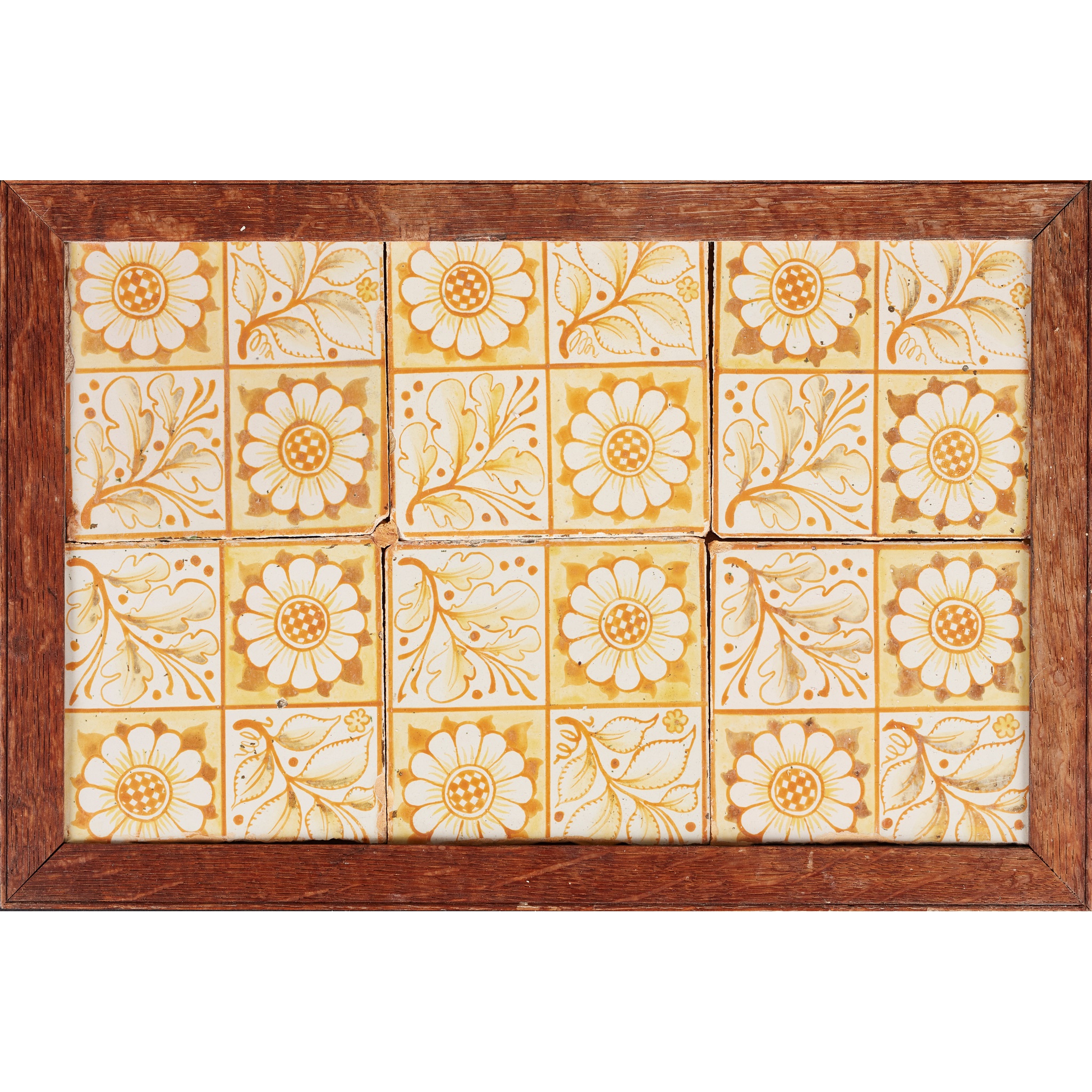 tin-glazed and painted earthenware, framed, applied paper label