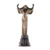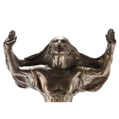 George Meredith’s The Story of Bhanavar the Beautiful, from a collection of pseudo-oriental stories titled The Shaving of Shagpat was first published in 1856 and became a popular subject of artists and sculptors of the period. The tale follows Bhanavar, an Arabian beauty and innocent daughter of a Caucasian amir, who gains possession of a magical jewel and is transformed into an evil queen of the serpents. In Alexander Fisher’s rendition he captures Bhanavar at the moment of transformation, with her arms held aloft to the heavens, creating a femme fatale figure that was a source of fascination to the public, as was shown in art and literature of the period, in the latter half of the long nineteenth century.