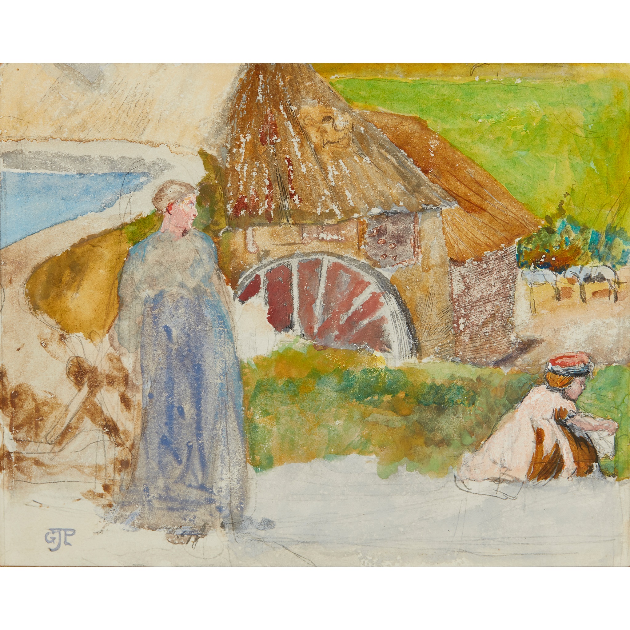 Signed with initials (lower left), pencil and watercolour heightened with bodycolour and with scratching out