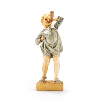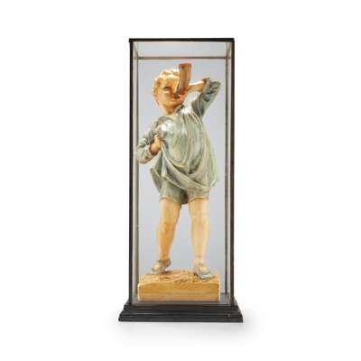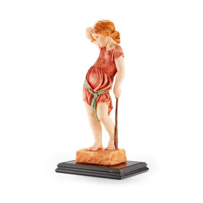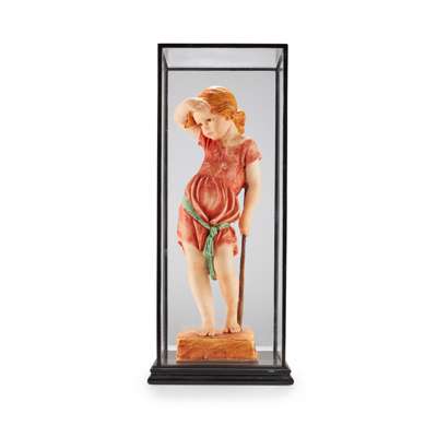 painted wax, glazed and ebonized display case, comprising a BOY, 38.5cm (15 1/4in) high; and a GIRL, 38.5cm (15 1/4in) high, each incised monogram and date