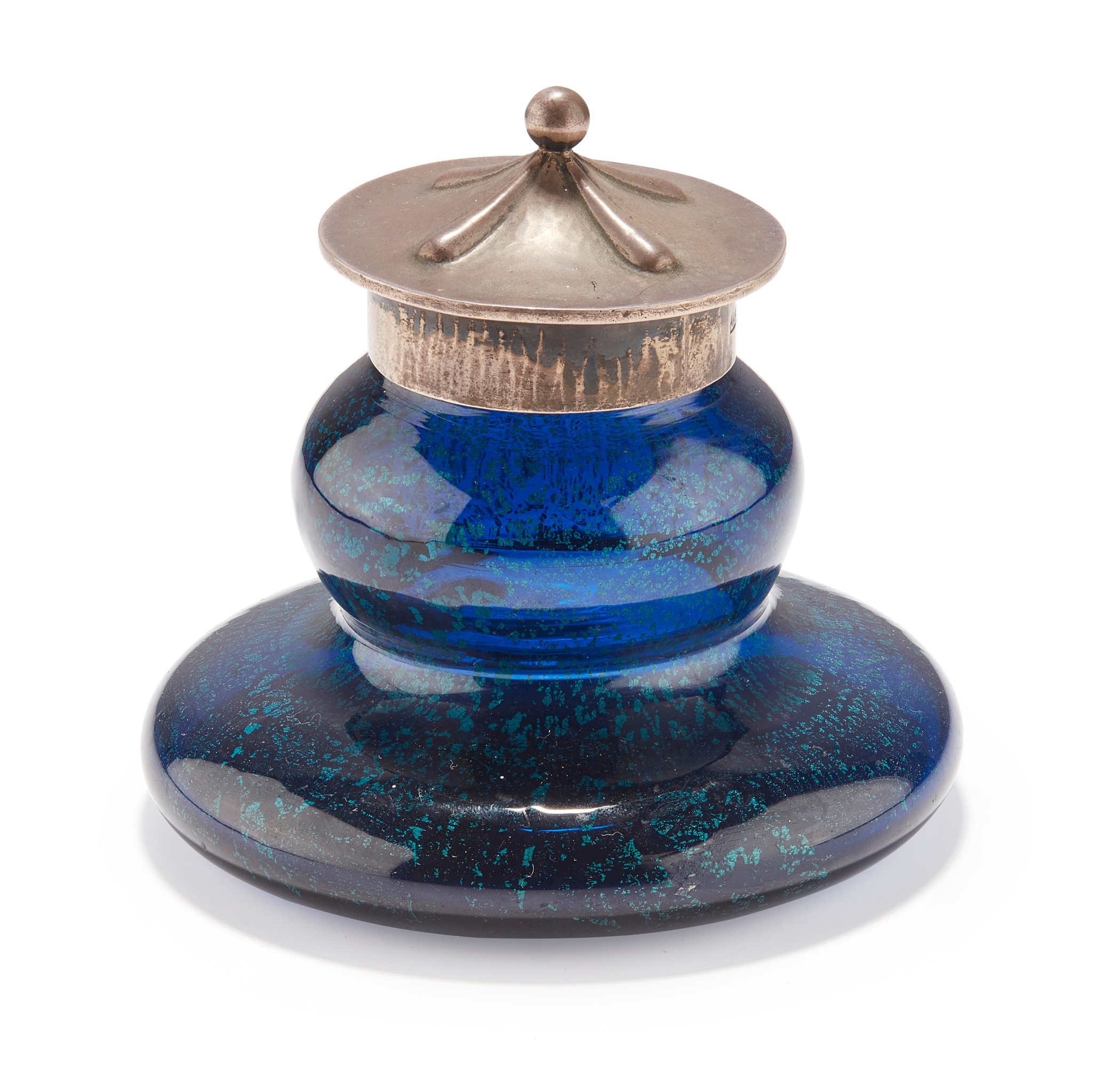 internally decorated blue glass with silver cover, the cover stamped with maker's mark JP&Ss, hallmarked London 1909