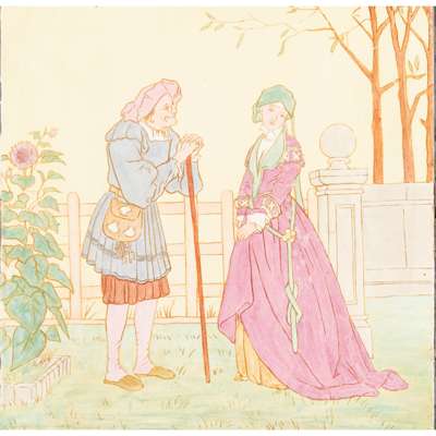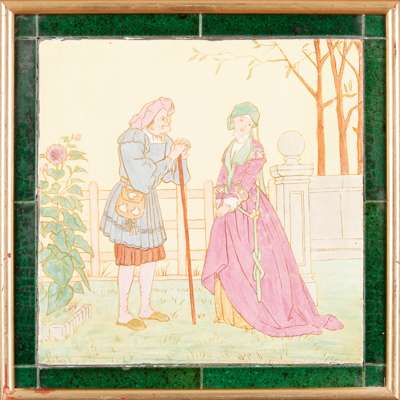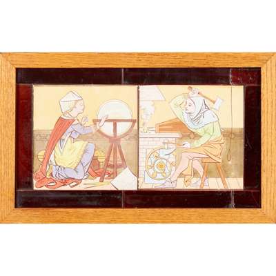 printed and painted earthenware, impressed COPELAND, 15cm (6in) sq. each; together with a LARGE COPELAND SINGLE FRAMED TILE, depicting AGE & YOUTH, 30.5cm (12in) sq.