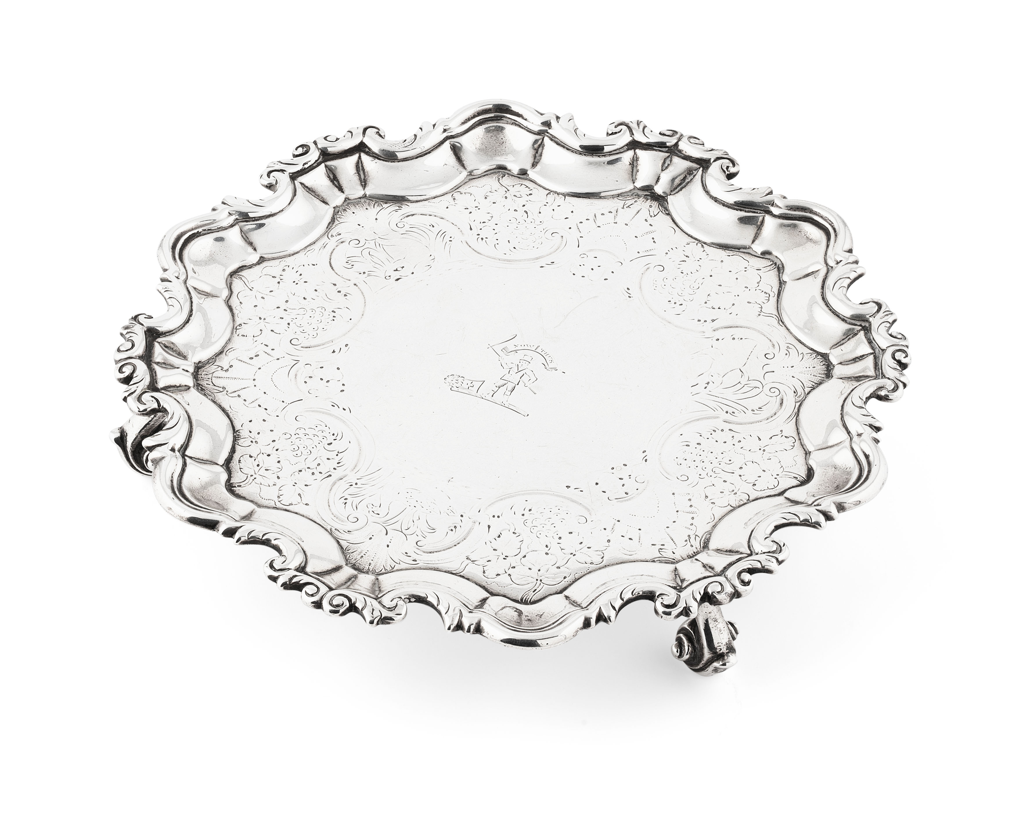 of circular outline with scalloped rim, engraved scrolling and foliate detail and armorial to centre, on three scrolling ball feet
