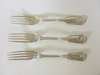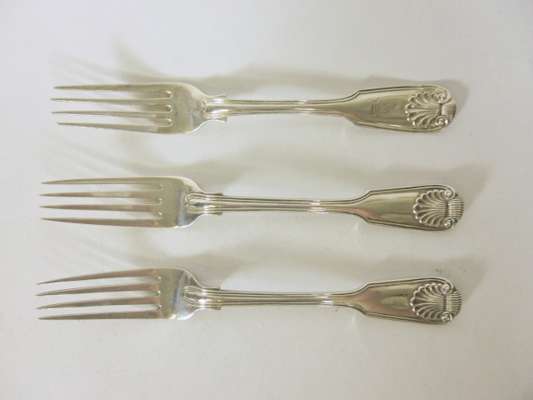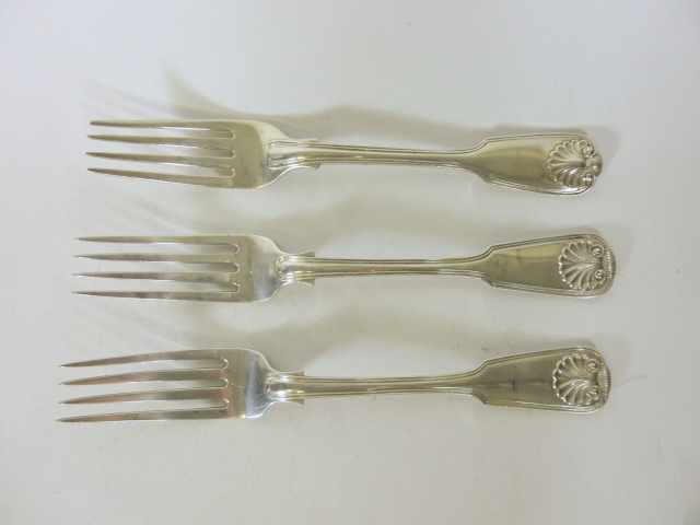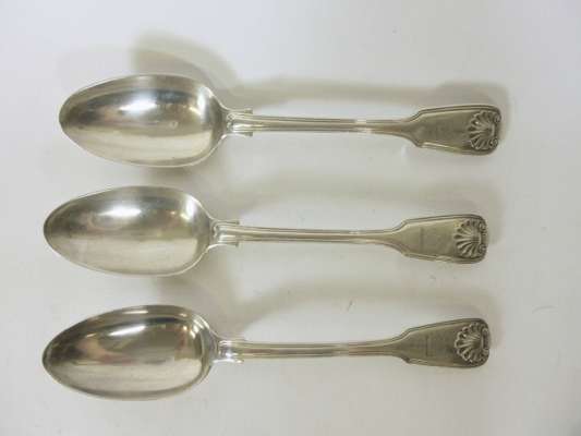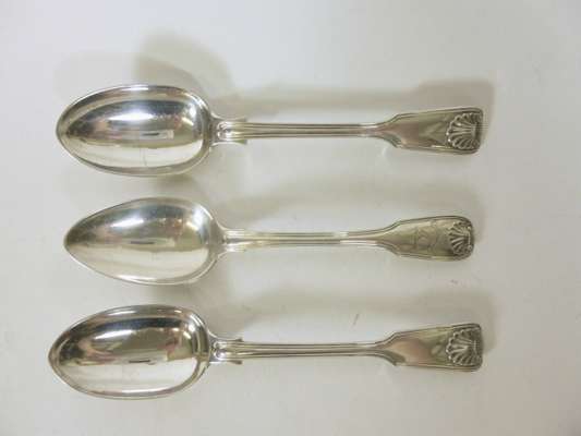 comprising ten table spoons, sixteen dessert spoons and twelve table forks, engraved with various initials and crests (double struck); together with TWO CONTINENTAL TABLE SPOONS, also fiddle, thread and shell pattern (qty)
