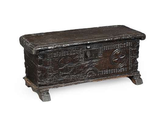 the hinged rectangular top with a moulded edge, above a chip carved front panel with flower motif roundels, raised on trestle feet
