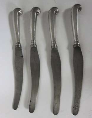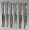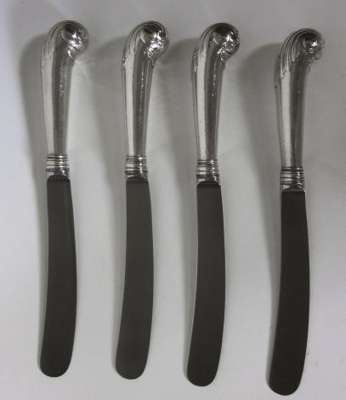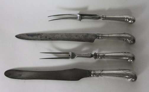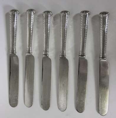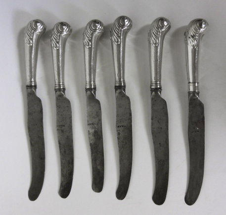 comprising: a matched set of eight pistol grip table knives; a SIMILAR CARVING SET; a SET OF SIX SECOND COURSE KNIVES, leaf clasped pistol grip handles, the steel blades stamped 'READ'; TWELVE SILVER HANDLED LEAF CLASPED PISTOL GRIP TABLE KNIVES; modern steel blades; and SIX SILVER HANDLED TABLE KNIVES, leaf clasped decoration, engraved crest, plated blades (qty)