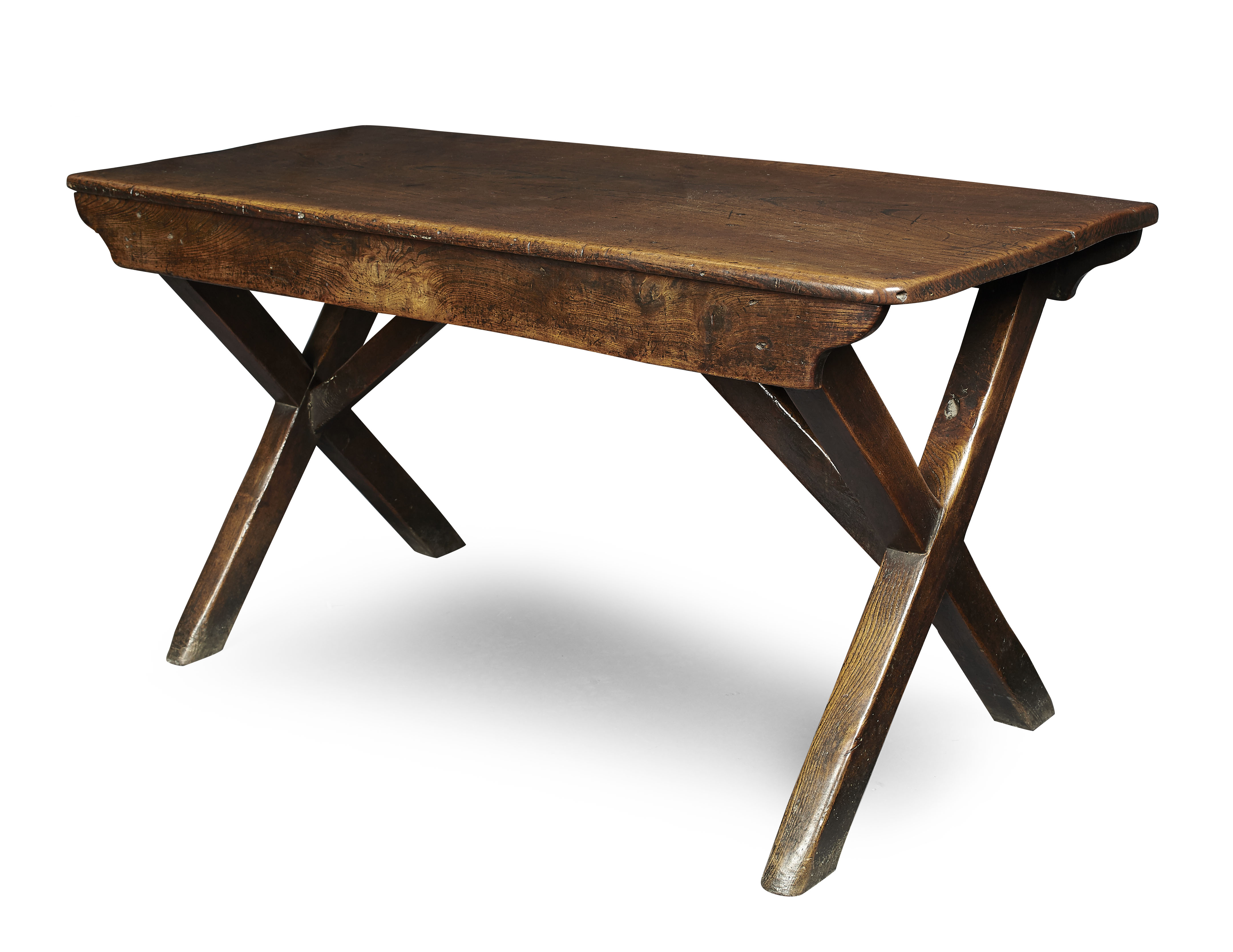 the rectangular top carved with a Shove Ha'penny game board, raised on twin X-form trestle end supports, joined by stretchers