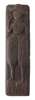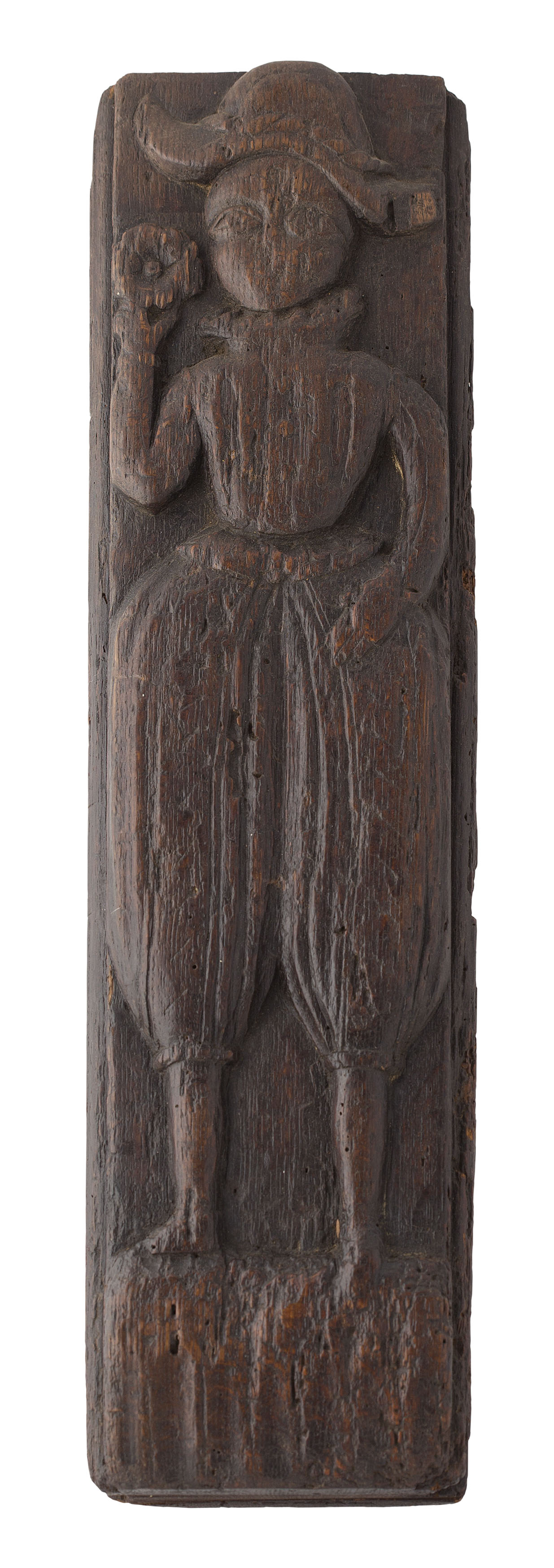 carved with a standing figure wearing a hat, ruff collar, and voluminous breeches, holding a flower in his right hand