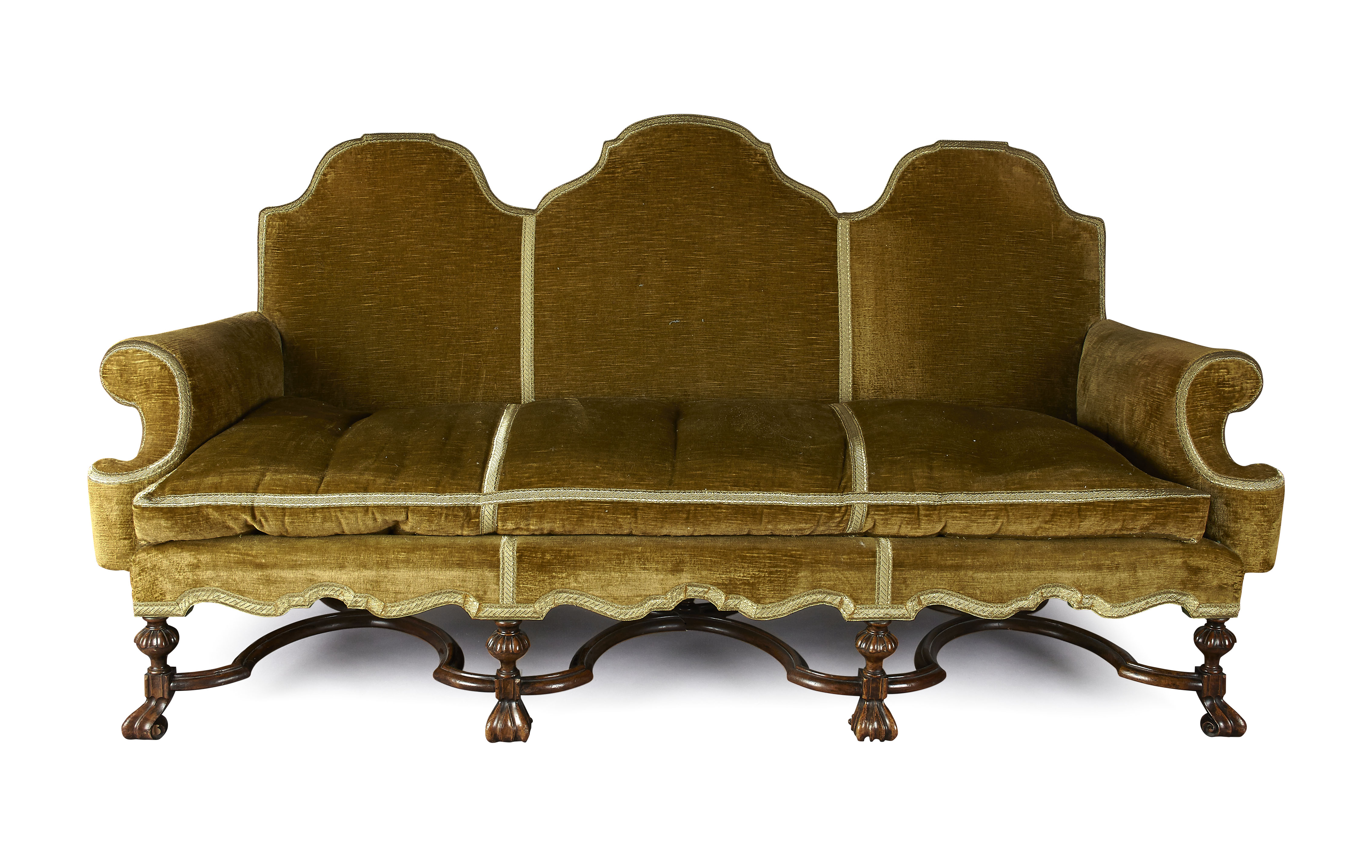the high triple arch back over a loose cushion seat and scrolled arms, raised on carved legs with lobed buns and ending on scroll feet, joined by a shaped stretcher, in green velvet upholstery with tassle trim