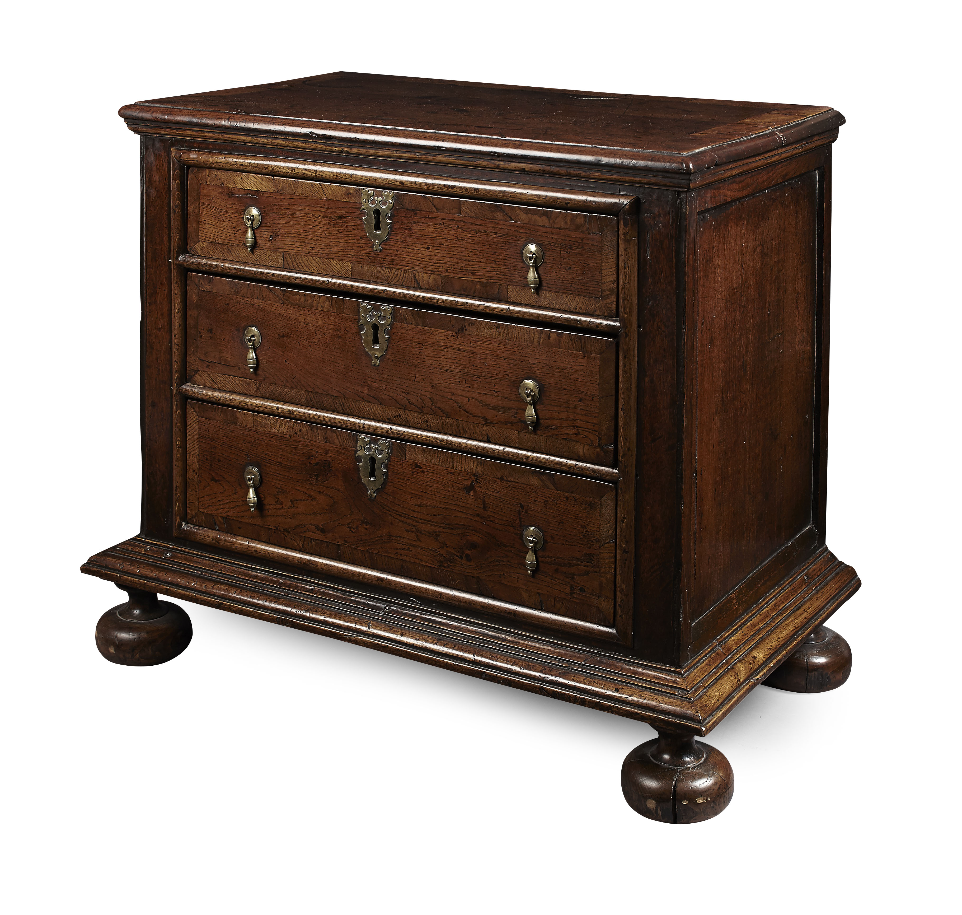 the moulded rectangular top above three long graduated drawers, raised on bun feet, united by a moulded apron
