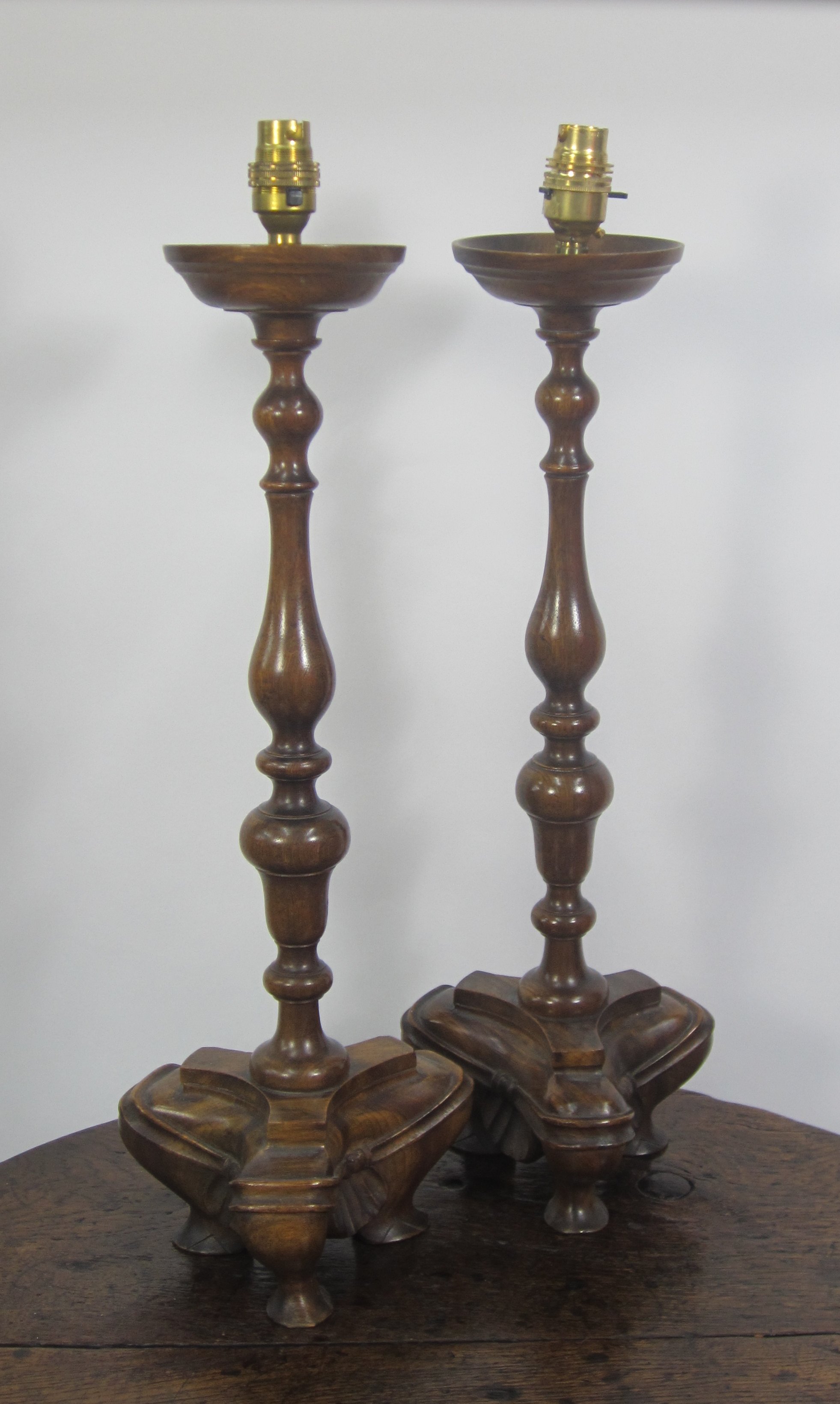 each with a knopped column on stepped tripod base, with ogee feet, wired for electricty (2)