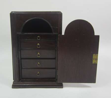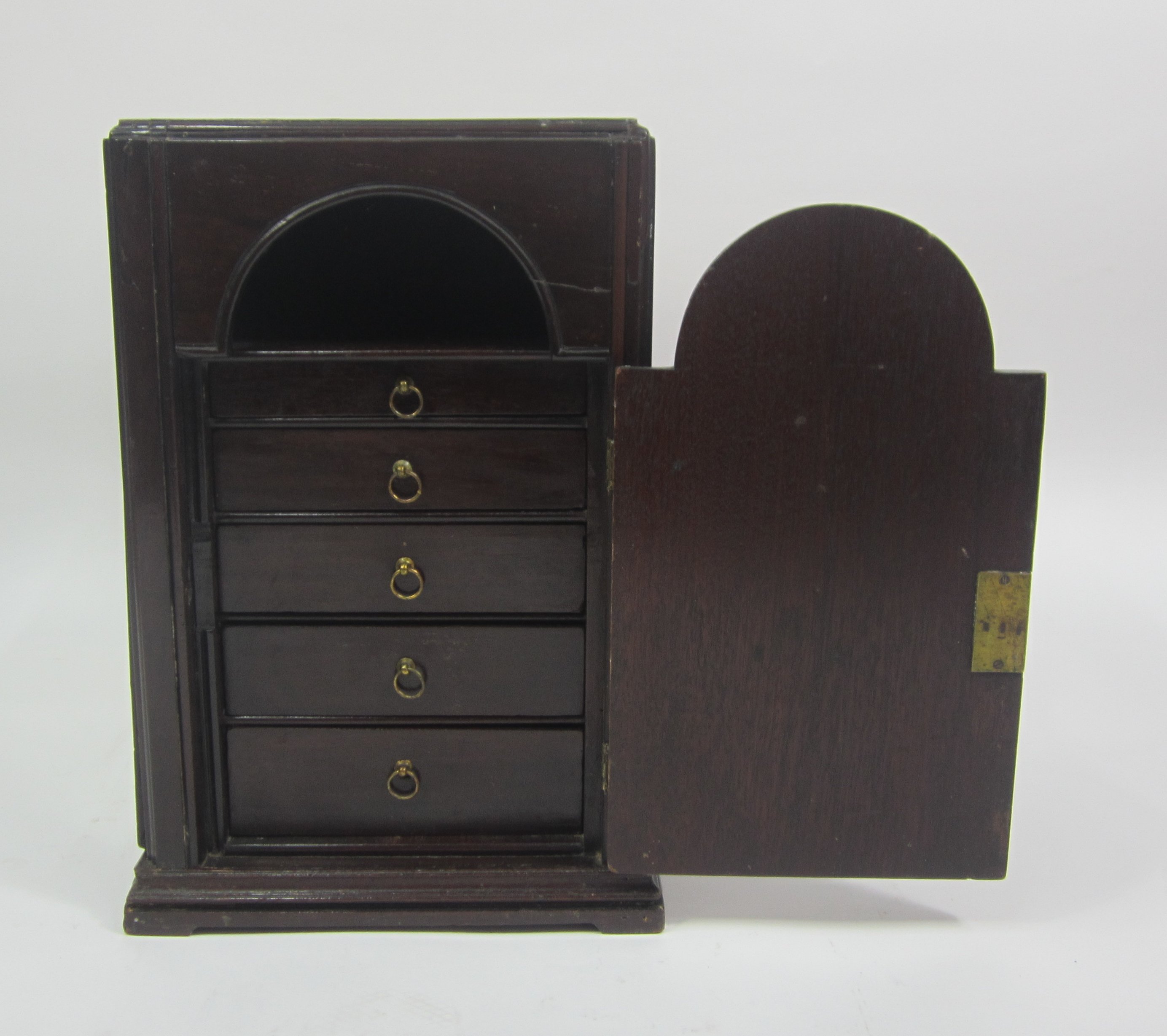 the caddy moulded rectangular top above a ratchet adjustable mirror and one later lateral arched cupboard door, opening to reveal a fitted interior with five small drawers