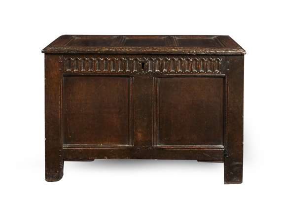 the triple panel hinged top above an arcaded carved frieze and two panel front, raised on stile feet