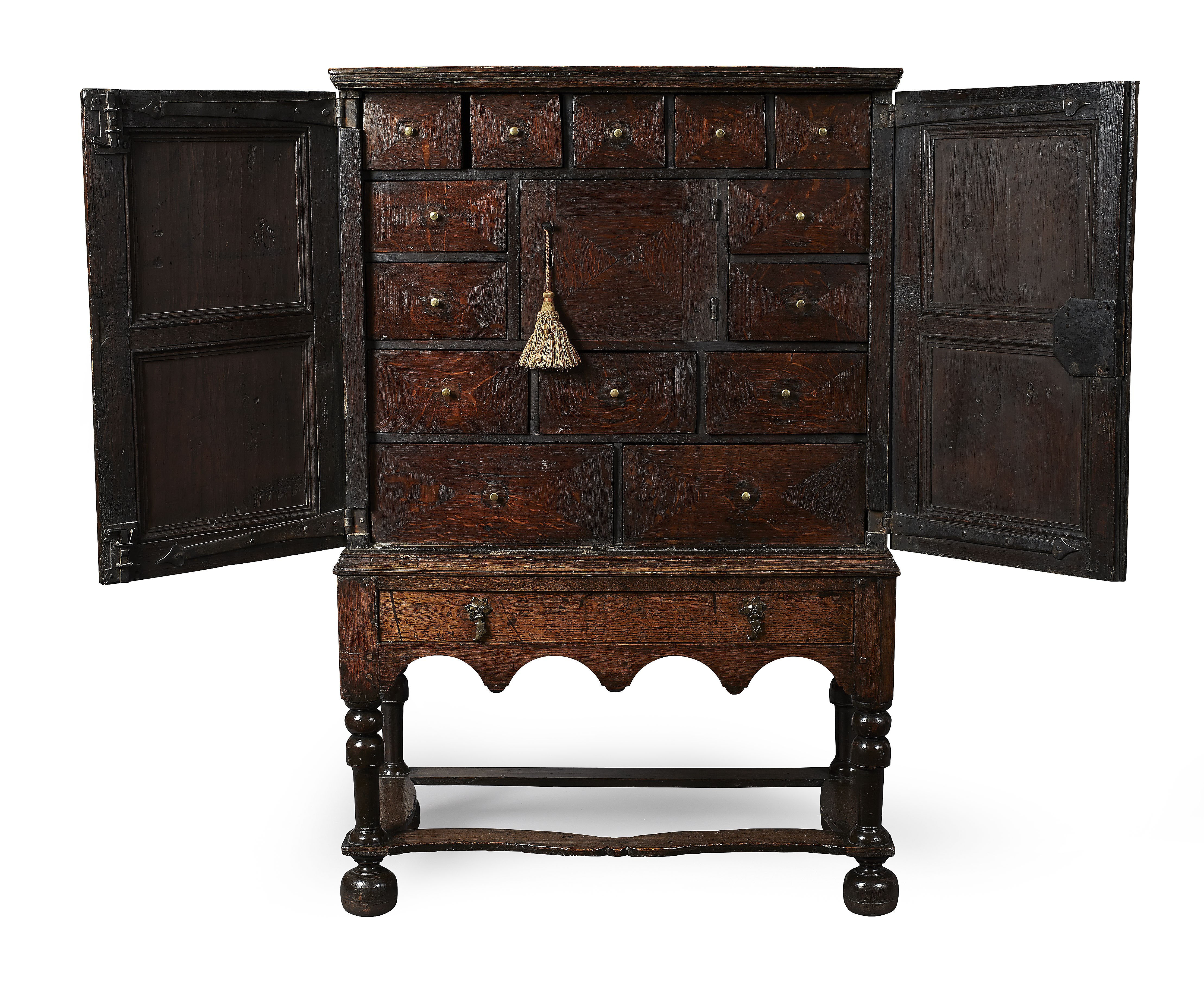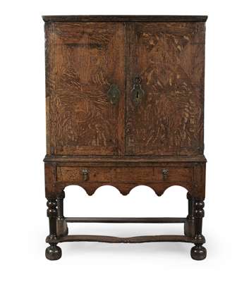 in two parts; the moulded rectangular top above a pair of parquetry cupboard doors opening to an arrangment of short drawers and a central door opening to three further drawers; the stand with a long frieze drawer above a shaped apron, raised on baluster turned legs joined by a flattened curvilinear stretcher, raised on bun feet