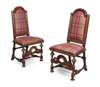 the arched backs and drop-in seats covered in tartan fabric, the lobed turned supports joined by scroll carved openwork stretchers (2)