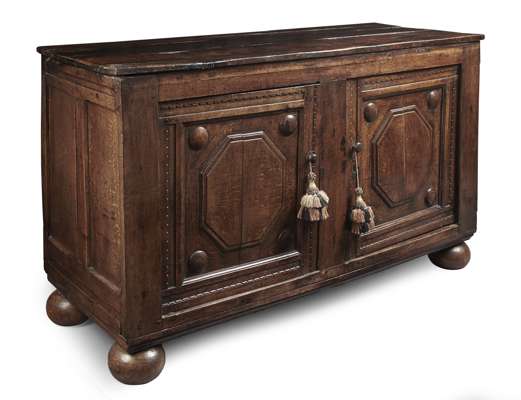 the later plank top above two panel cupboard doors, opening to a shelved interior, raised on later bun feet