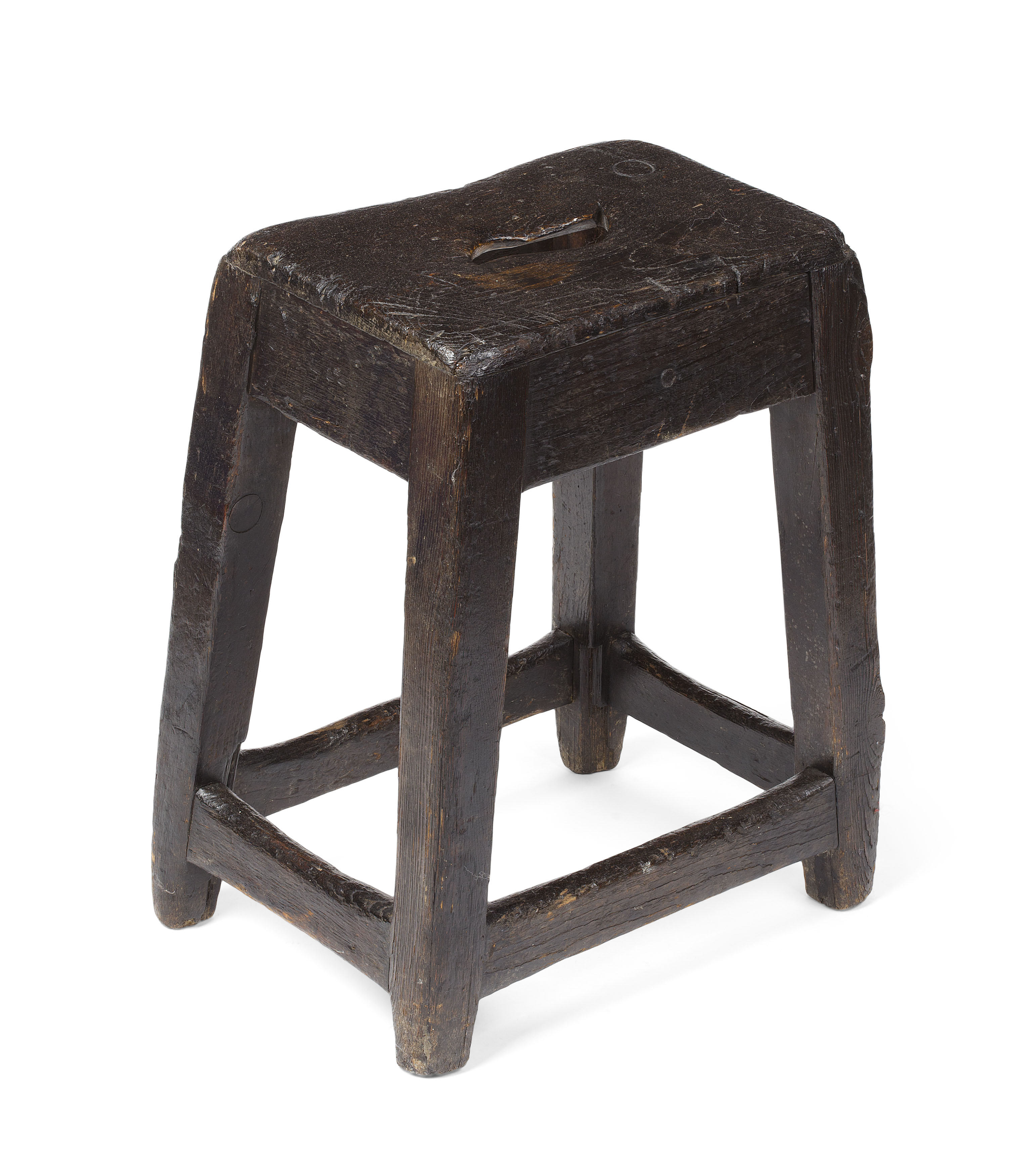 the rectangular seat with a pierced carrying aperture, raised on square tapered legs, joined by peripheral stretchers