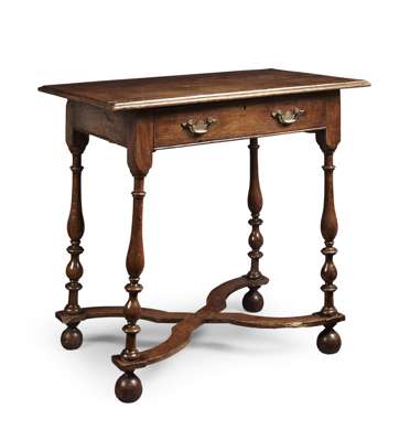 the moulded rectangular top above one frieze drawer, raised on four baluster turned legs united by an X-form stretcher and ending in bun feet
