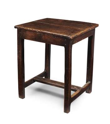the rectangular plank top raised on chamferred square legs united by an H shaped stretcher