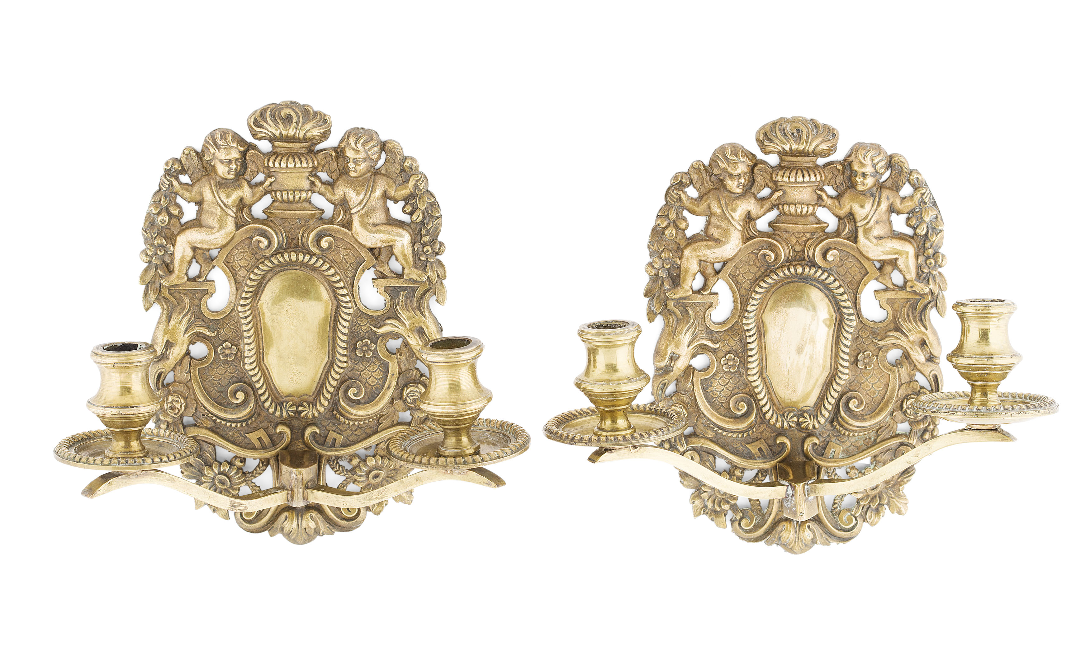each cast with a cherub above scrolling birds and flowers, with two out-scrolling candle arms (2)
