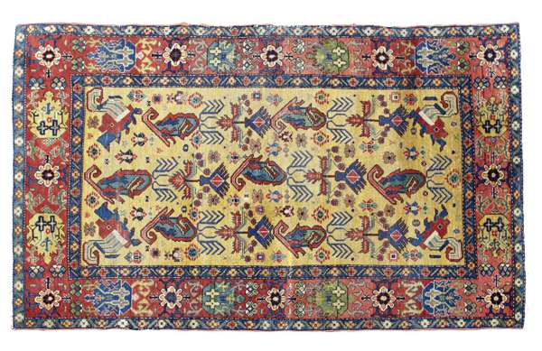 the lemon field with allover stylised boteh and foliate pattern, within pinkish red stylised palmette and rosette border between blue bands