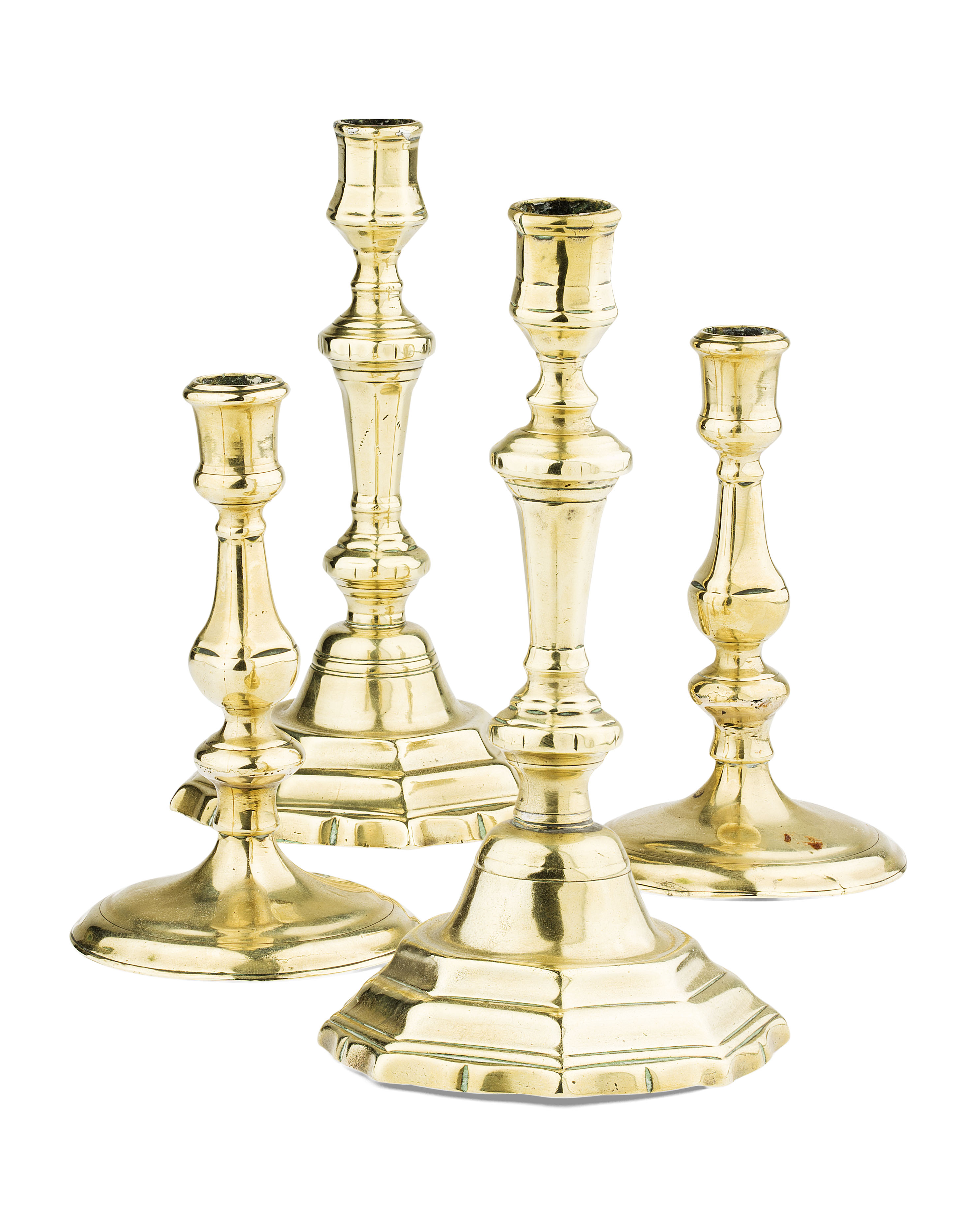 TWO PAIRS OF GEORGIAN BALUSTER BRASS CANDLESTICKS