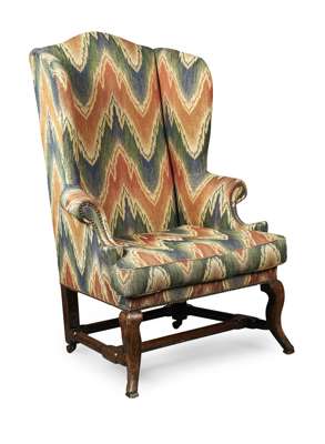 the high back with an arched top rail, over curved wings and short scroll arms and loose cushion seat, raised on square cabriole legs, joined by block turned stretchers