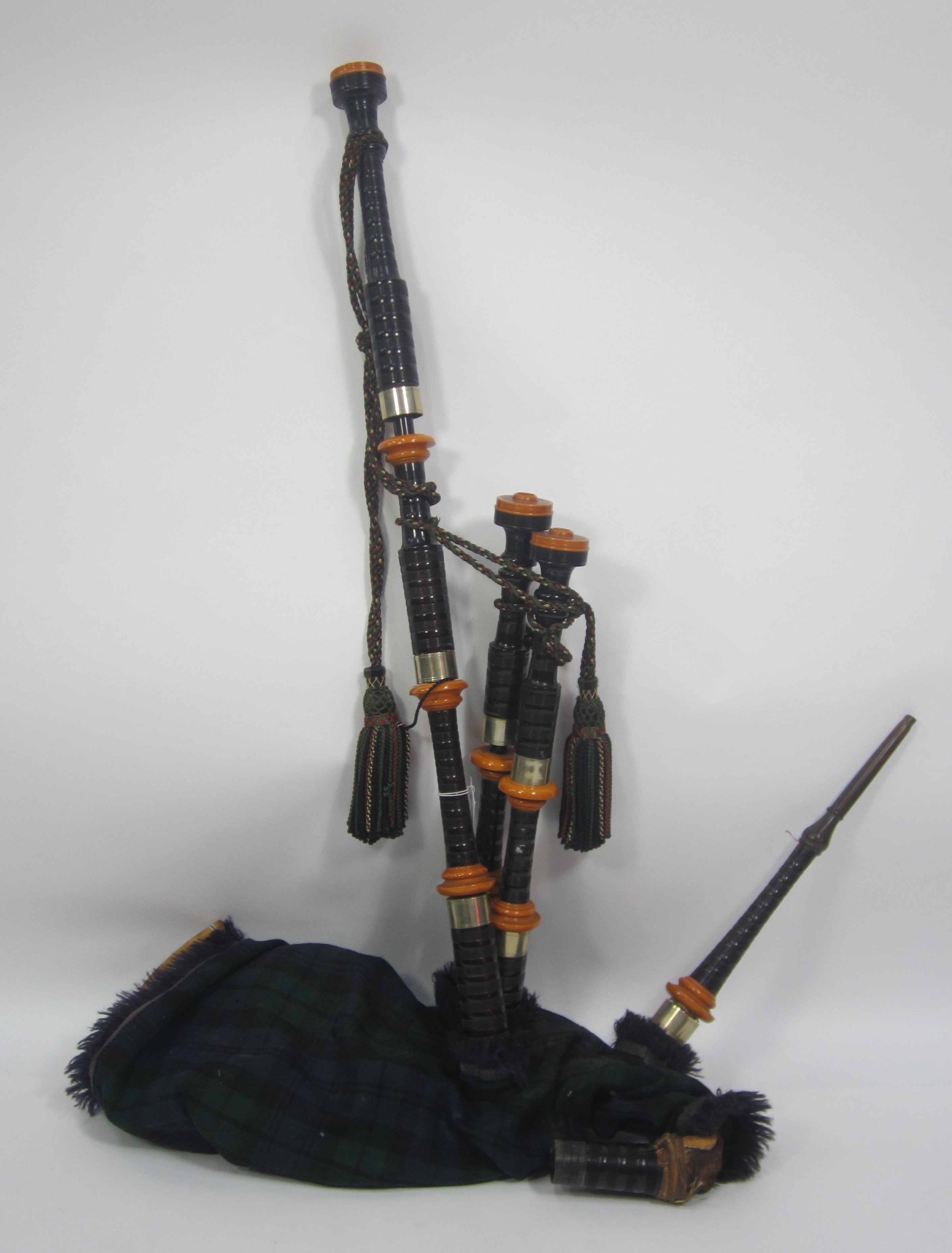 of traditional form, with turned hardwood drones, chanter and mouthpiece, with blue and green tartan covered leather bag, the chanter signed 'R.G. Lawrie, Edinburgh'; together with another chanter, ivorine mounted signed 'Alexander'