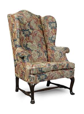 the high straight back with an arched toprail and deep curved wings, above scroll arms and a loose cushion seat, raised on cabriole legs ending in pad feet and joined by turned stretchers