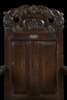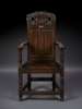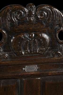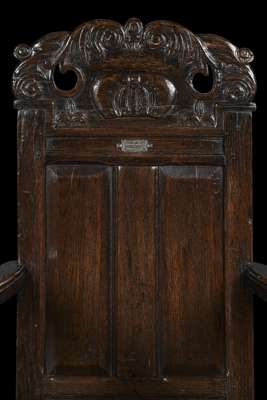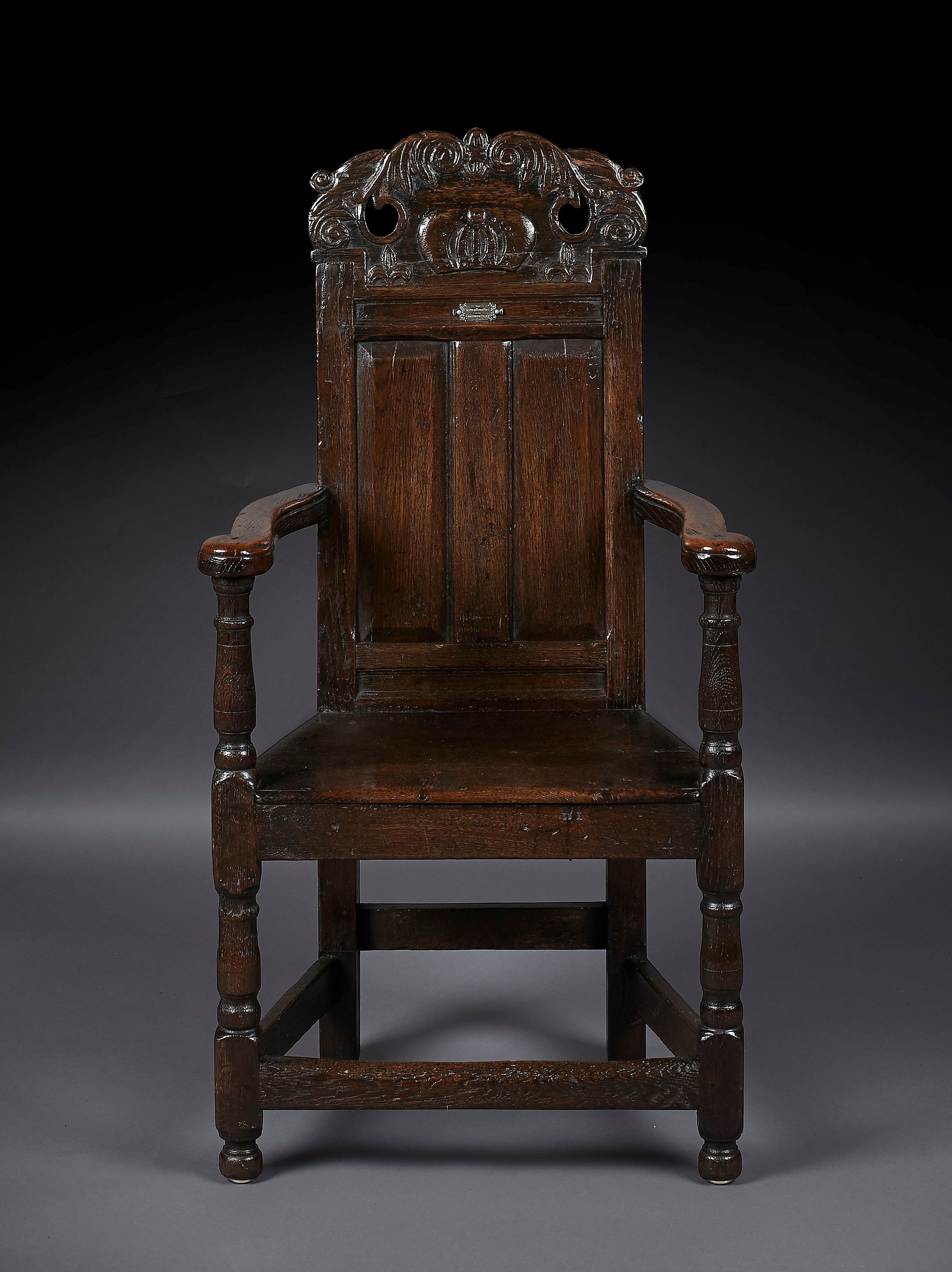 the acanthus carved and pierced toprail centred by a crown, above a panel back and outscrolled arms, the spreading plank seat raised on baluster turned and block legs joined by stretchers and endin on turned feet, bearing a white metal plaque inscribed: 'OLD SCOTTISH CROWN CHAIR FROM LINLITHGOW PALACE'