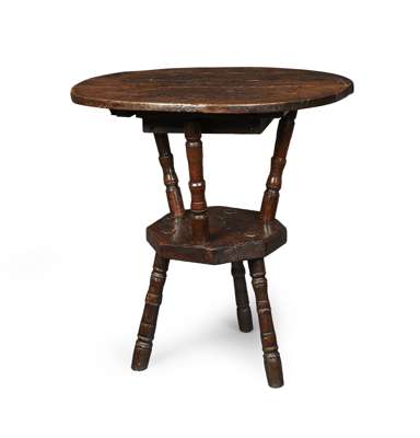 circular top with a single drawer below, raised on three spindle supports, over an octagonal undertier, raised on a tripod base
