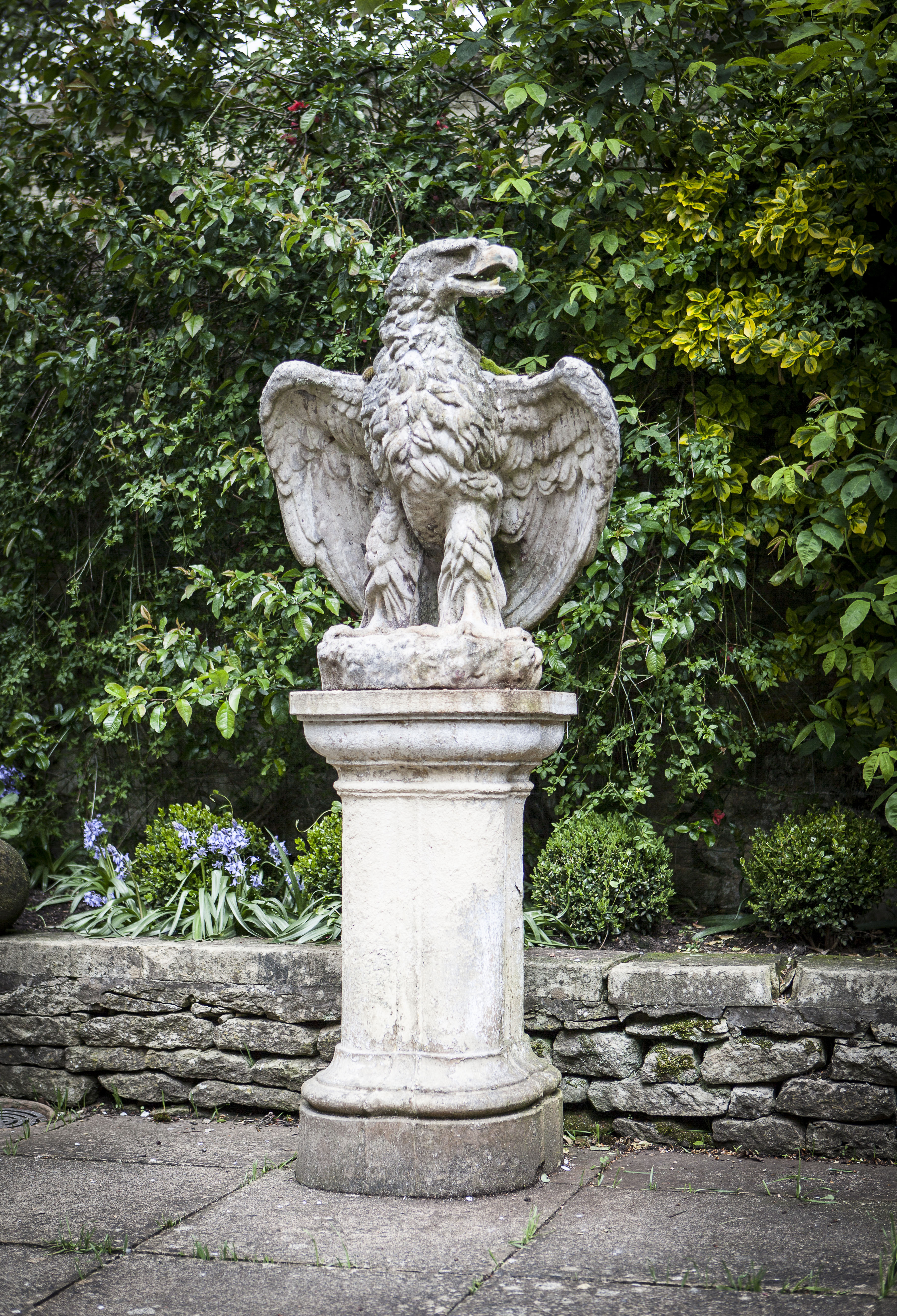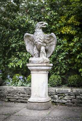 with wings spread and head turned to the left, on a composition stone column pedestal