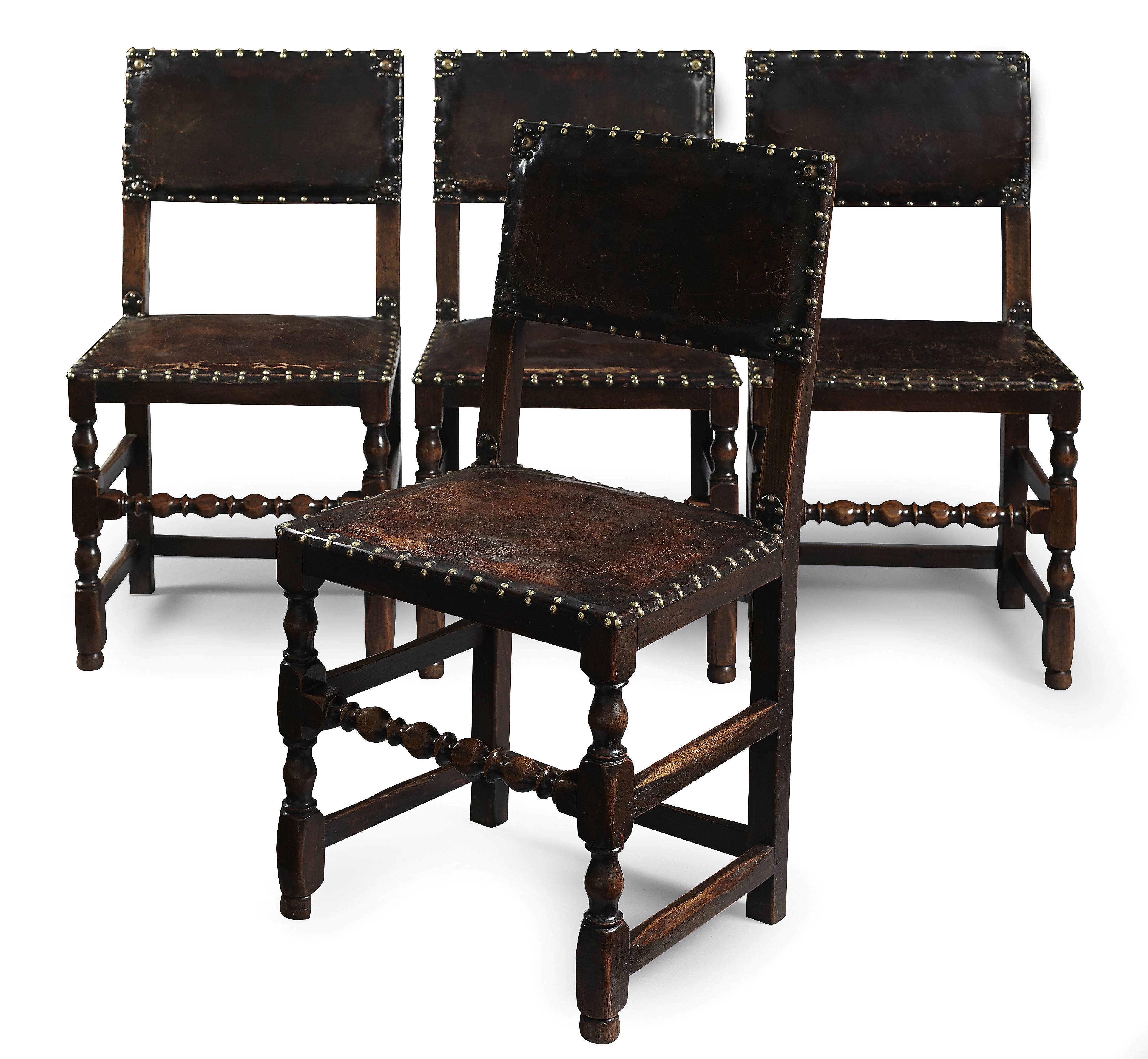 the square brown leather upholstered backs and seats with brass stud decoration, raised on block turned legs, joined by peripheral stretchers (4)