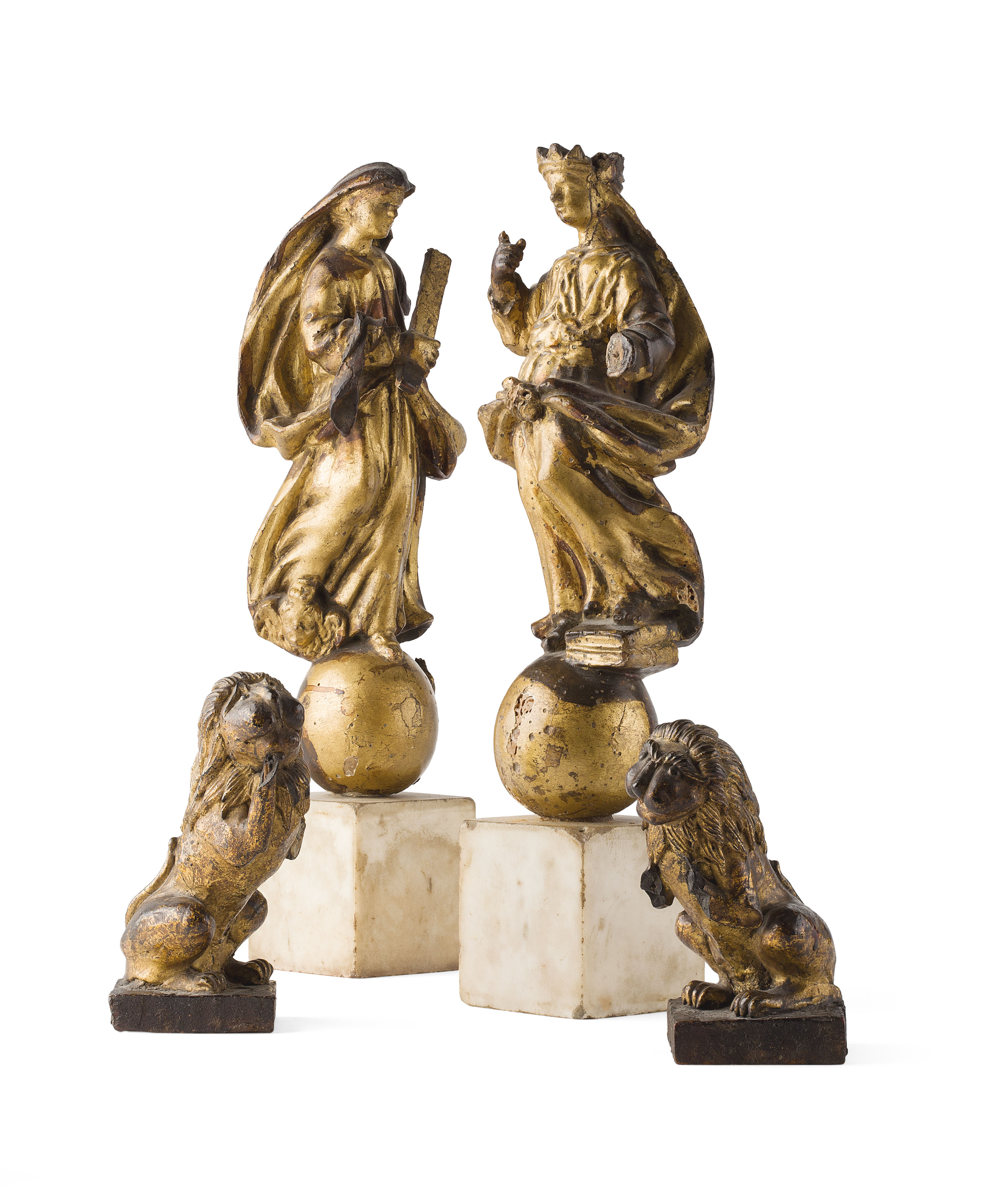 each standing on an orb, on later white marble cubic bases; together with a PAIR OF CARVED GILTWOOD FIGURES OF LIONS, 17th century, 16cm high (4)