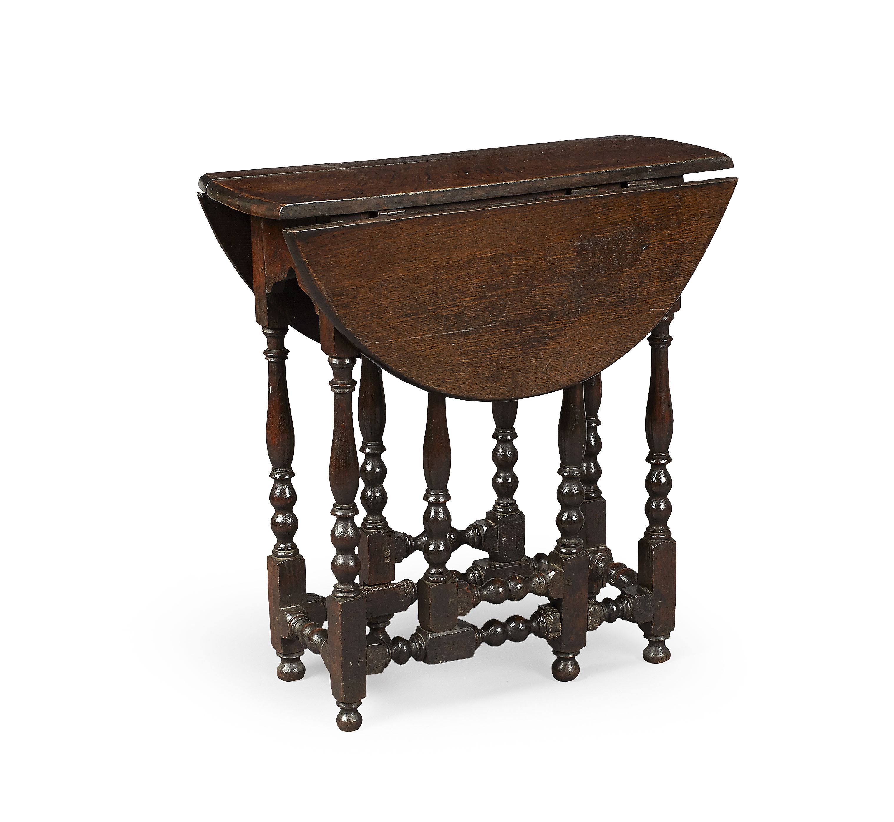 the oval top with drop-down sides, on baluster legs joined by turned stretchers, raised on ball feet