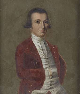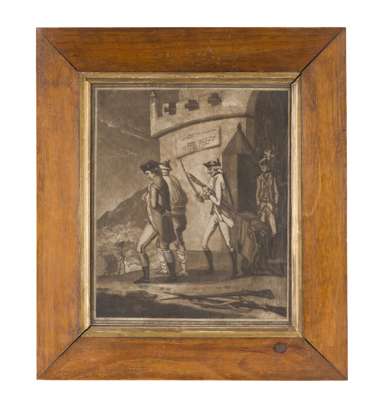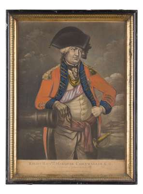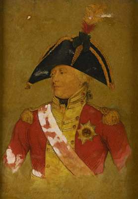 25.5cm x 19cm (10in x 7.5in) and a small oil portrait of a gentleman; two reverse prints on glass of Cornwallis and Moreau; and a French and English military cartoon print (6)